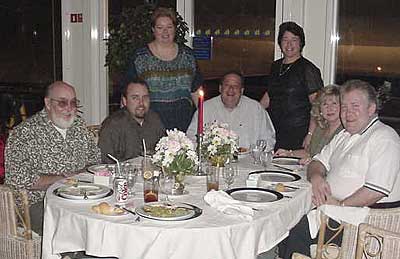 Dinner at the Magnifico Aboard the Costa Victoria, there are many different dining options. One is in the Magnifico Restaurant. Here, an eight-course meal is served in a romantic setting with first-class service and food. Enjoying this culinary experience are Gator England, Mike O'Malley, Elaine England, Rich Korbin, Jan Fisher, Jill Maverick, and Paul Thornton. It is guaranteed that no one left hungry.