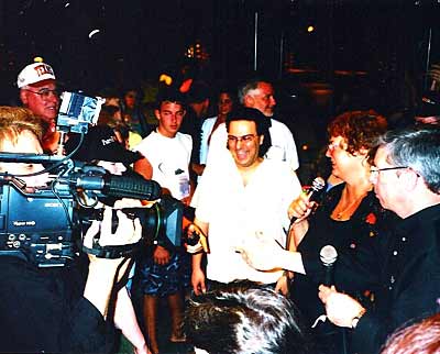 Photographers totally engulf Kathy Liebert, the winner of the PPM, and runner-up Berj Kacherian as Linda Johnson and Mike Sexton try to interview them. The Travel Channel was on hand the entire week and taped not only the event, but also the whole cruise experience. This is scheduled to air on the Travel Channel about eight times in the next year. We certainly will send out airing information to our newsletter subscribers as it becomes available. You can see the enthusiasm generated by this premier event. Begin qualifying today so that you don't miss the boat for the PPM2! Photo © 2002, Jan Fisher |