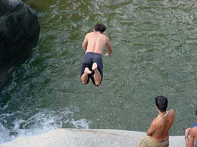 Jordan Takes the Plunge Seeing the divers at Chico's Paradise in Puerta Vallarta gave our first time dealer Jordan, from Hollywood Park, his cue to join in. Although it made us a little nervous, Jordan did dive off of one of the cliffs into the pool below. Showing us "his best side" you can see him in midair. We were pretty impressed by his entry and although the level of difficulty may only have been a seven, we gave him a full ten for his enthusiasm and chutzpah! Way to go Jordan. Now please don't do it again!